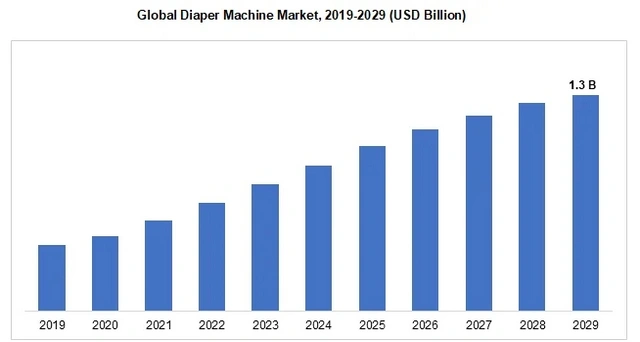 From 2021 to 2029, the worldwide baby diaper machine market is forecasted to grow at a CAGR of 4.6%, reaching USD 1.3 billion by 2029. This growth is fueled by various factors, including the rising number of nuclear families, working women seeking convenient infant care solutions, and the increasing prevalence of adult incontinence conditions. As the population ages and the incidence of diseases such as diarrhoea and dementia rises, demand for underpads, diapers, and other related products is expected to surge.